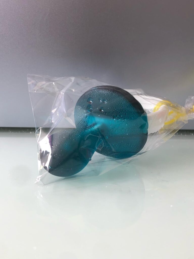 Una piruleta divertida con forma de un personaje amarillo con grandes gafas y sonrisa contagiosa. Ideal para los fans de los seres traviesos.