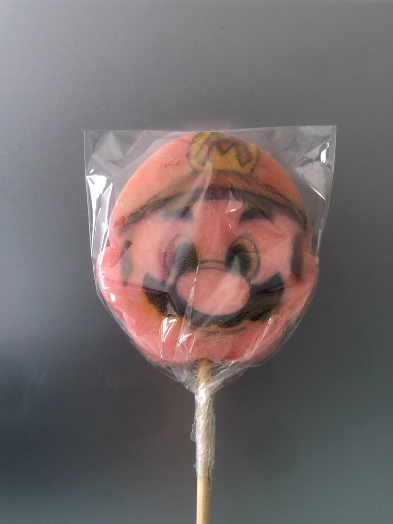 Esta piruleta tiene el rostro de un famoso fontanero bigotudo con gorra roja. Clásico, divertido y lleno de nostalgia.