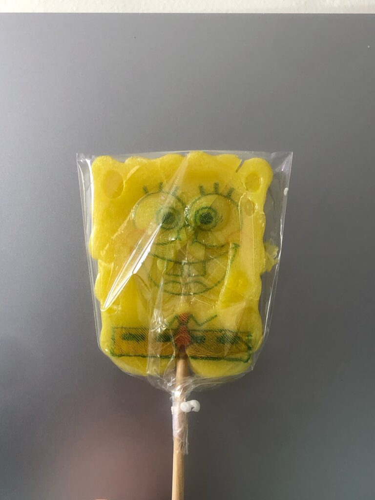 Una figura amarilla y cuadrada con grandes ojos, inspirada en un personaje marino muy querido. Llena de color y diversión.
